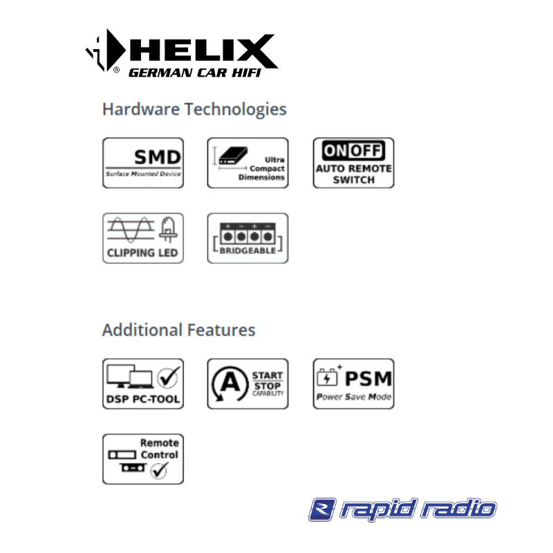 | Max. output power per channel* | Up to 240 Watts RMS @ 2 Ohms Up to 480 Watts RMS @ 4 Ohms bridged |